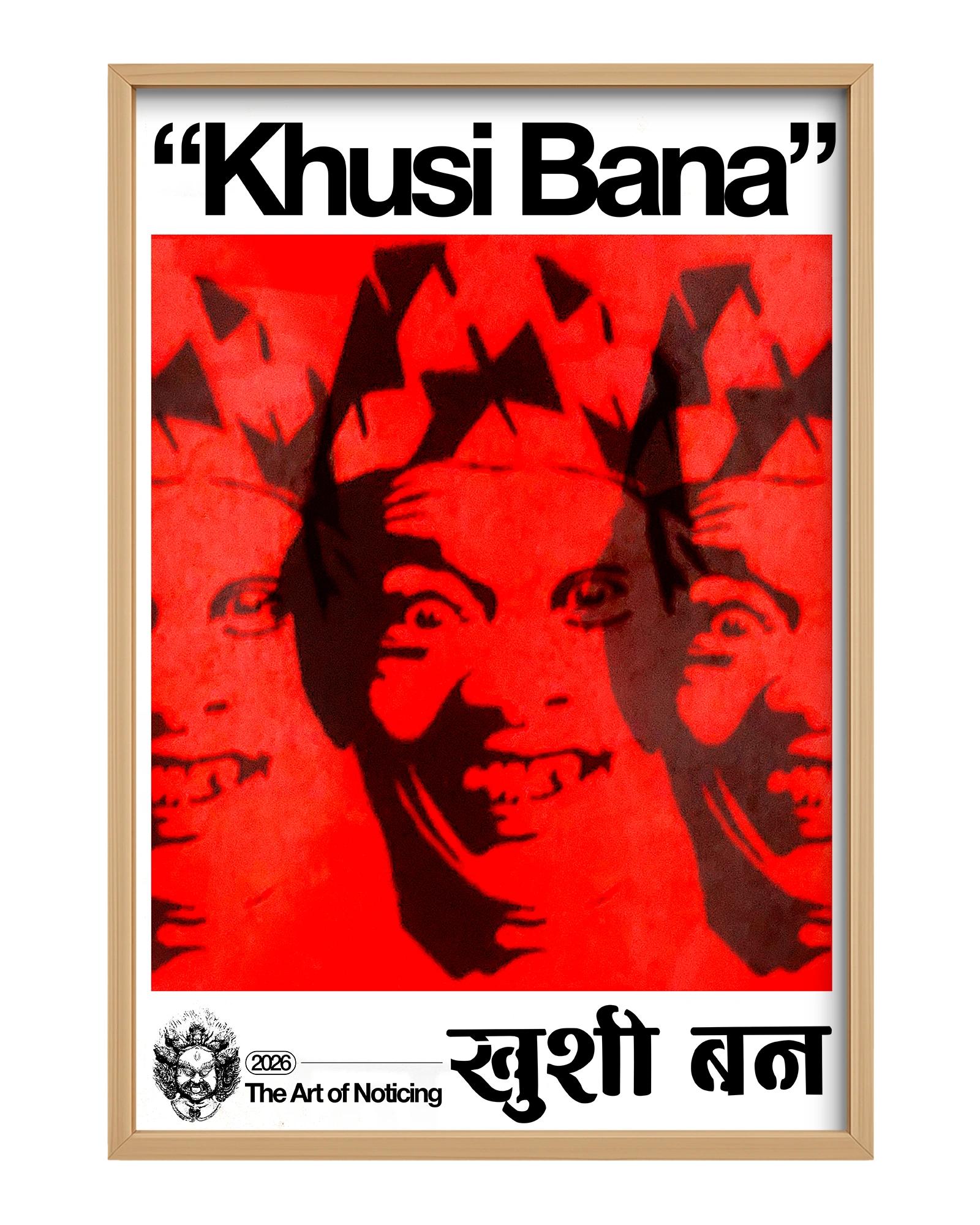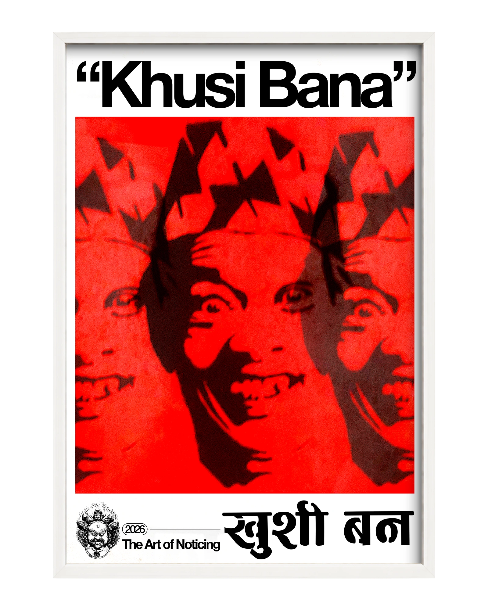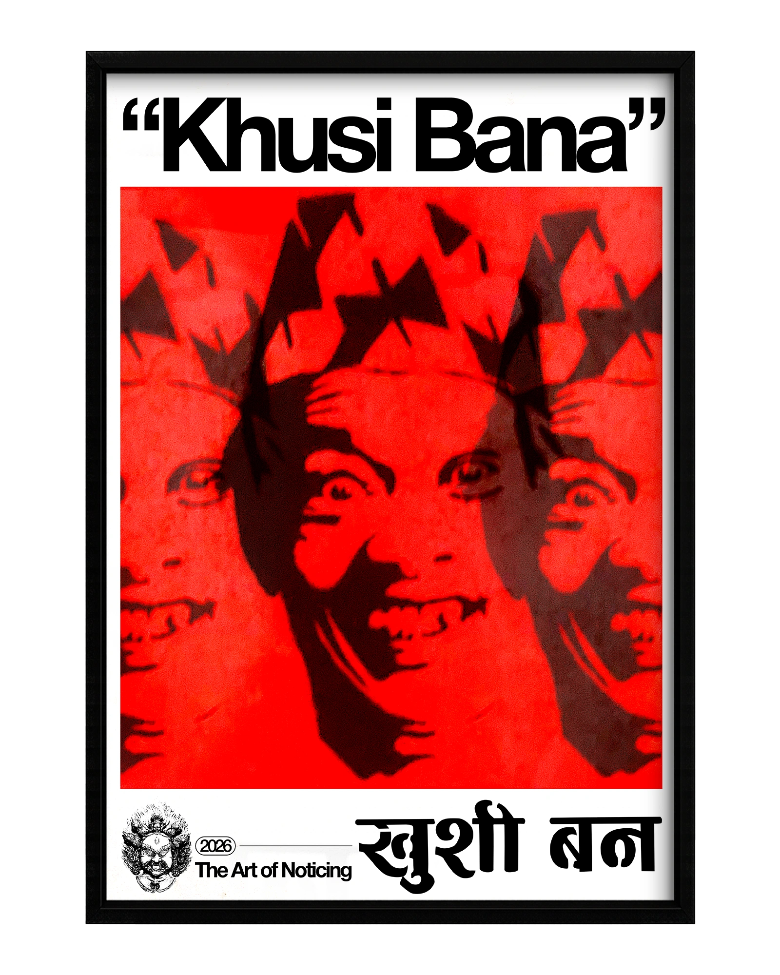 "Khusi Bana" means "Be Happy" in Nepali. The main silhouette artwork can be seen all across the streets of Kathmandu Valley. Many sources have claimed that the portrait features a very famous poet Bhairav Aryal. The art is divided into 3 halves, each showcasing different emotions. The portrait itself is very unsettling yet it commands us to be happy.