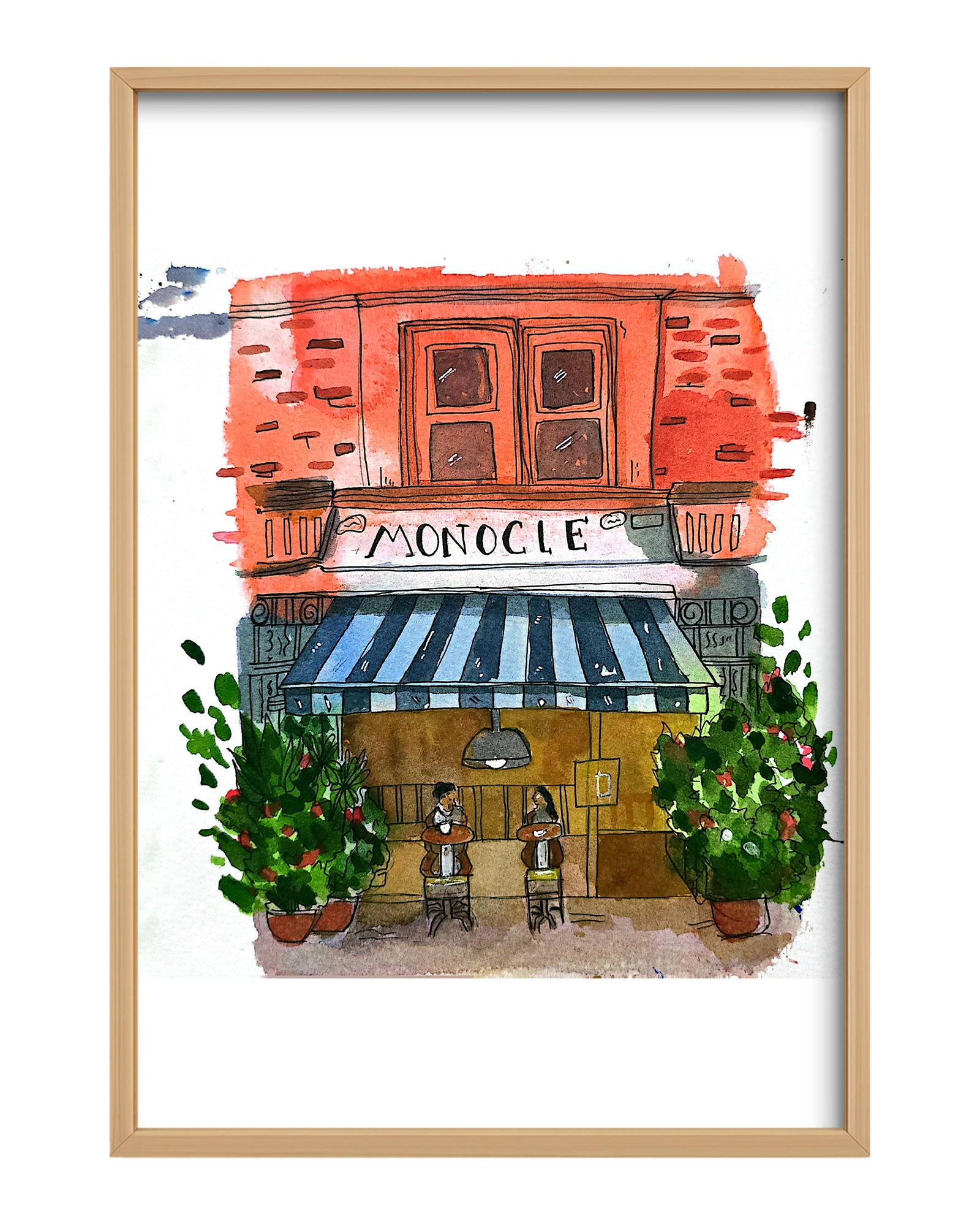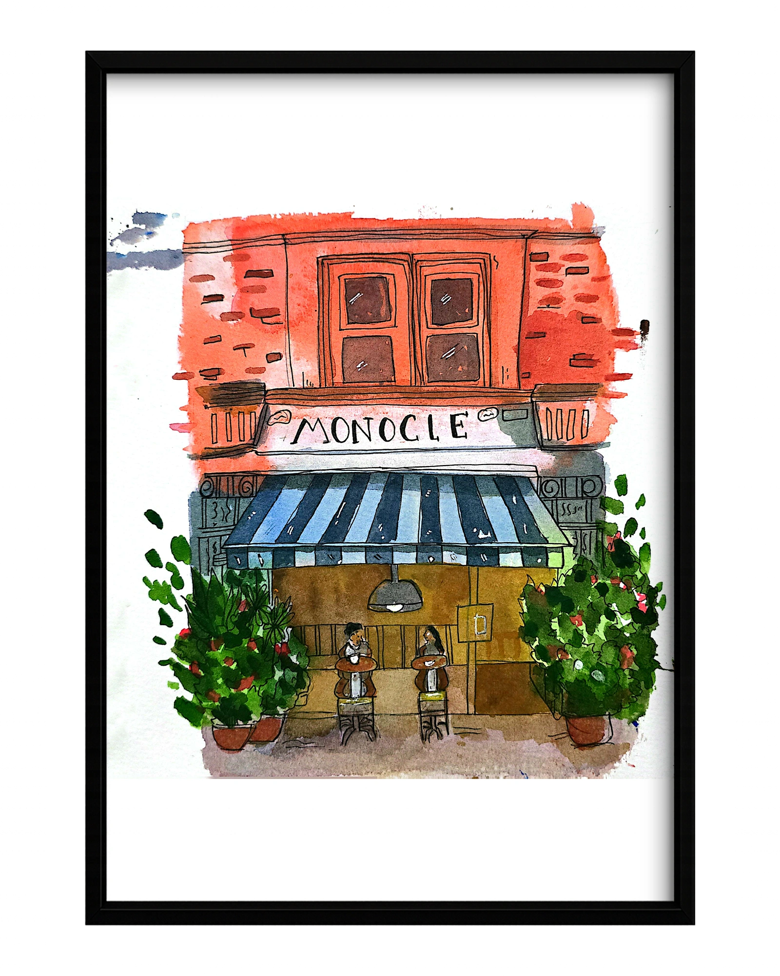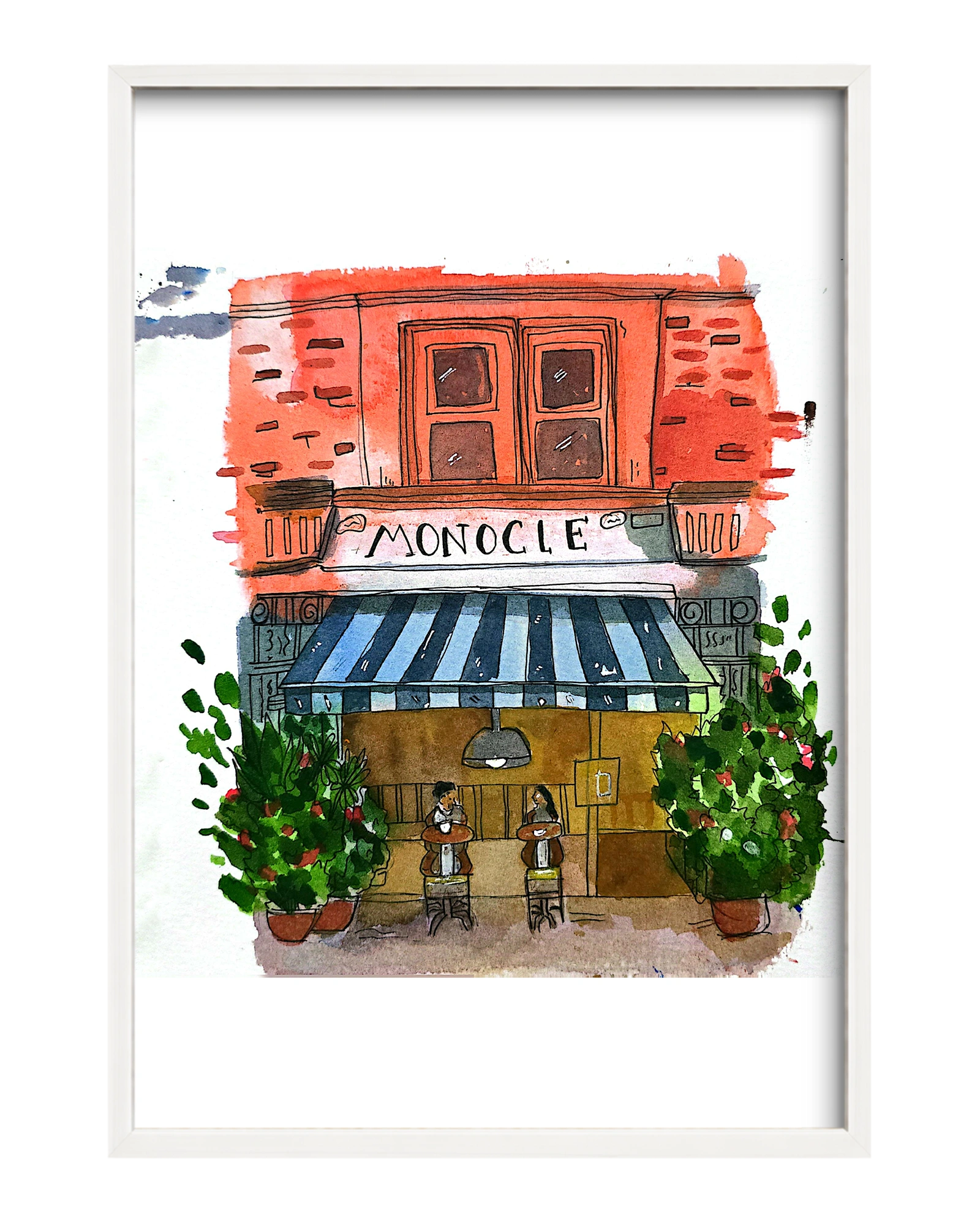 A fictional cafe portrayed beautifully via a watercolor urban art. The artist captures the motion of everything perfectly. Despite being a still art, it feels like there is movement and so much soul included.